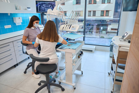 Dentist and assistant at a treatment, from the perspective of a patient. Dentist Holding Dental Tools.