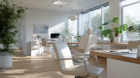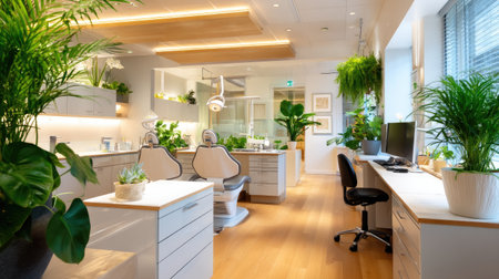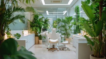 A sleek and modern dental office featuring lush green plants, natural light, and a clean, calming environment, ideal for patient comfort and wellness.