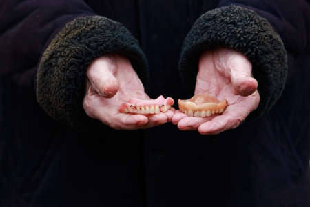 Dentures on a dark background. Close-up of dentures. Dentistry is conceptual photography. Prosthetic dentistry. False teeth. Prosthetics. Close-up of plastic dentures. Teeth on a wooden background