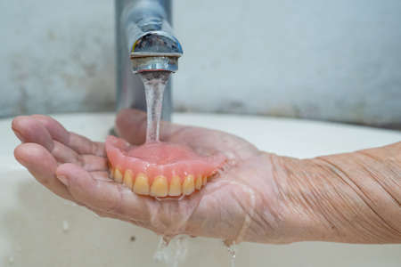 Asian senior or elderly old woman patient holding partial denture of replacement teeth.