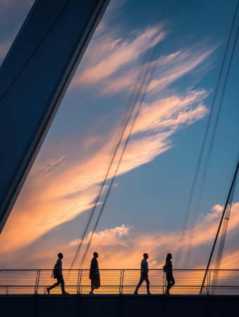 Person walking on modern architecture metal bridge in silhouette in evening dusk light.