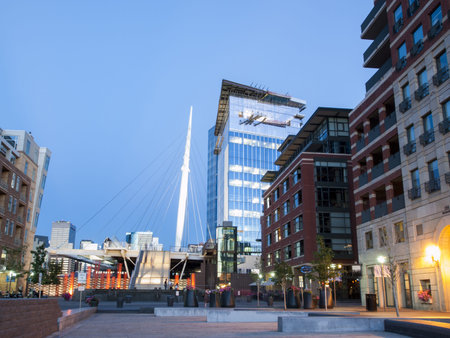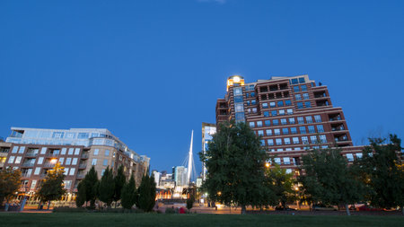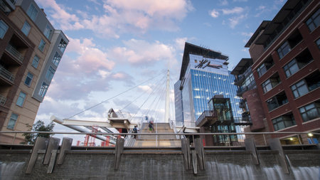 South Platte River Bridge, surrounded by modern apartments and office buildings in Commons Park . Denver, Colorado