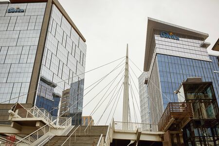 Chattanooga, TN - October 8, 2019: pedestrian walkway bridge in downtown Chattanooga with Tennessee Aquarium in the background