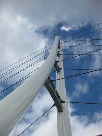 Worms eye view of a white triangular bridge with suspension cables crisscrossing a blue and cloudy sky