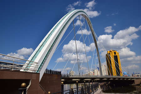Modern architectural urbanistic bridge across Ishim river. Interior futuristic bridge against sky Nur-Sultan, Astana, Kazakhstan. High quality photo