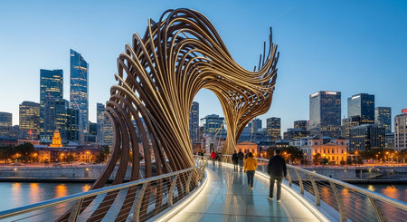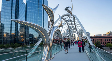 Millennium Bridge and wing statue at the Riverfront Park neighborhood of Denver, Colorado. Commons Park