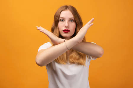 Image of serious woman 20s with wavy redhead, making X sign with crossed hands, gesturing stop, warning of danger. No way, stop doing. Wearing white t-shirt
