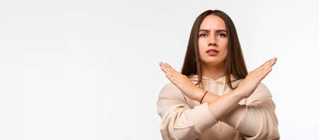 Image of serious woman 20s with long chestnut hair, making X sign with crossed hands, gesturing stop, warning of danger. No way, stop doing. Wearing casual beige hoodie