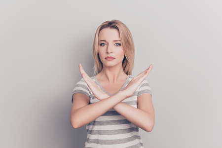 Girl with crossing hands sign make negation gesture. Portrait of pretty woman on gray background.