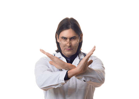 Male doctor with crossed hands - stop gesture. Isolated on white.