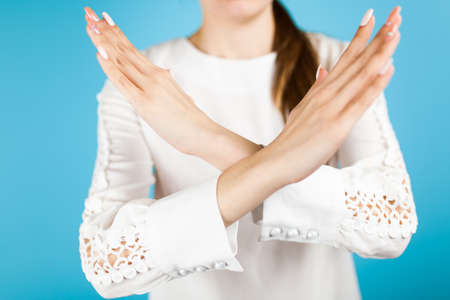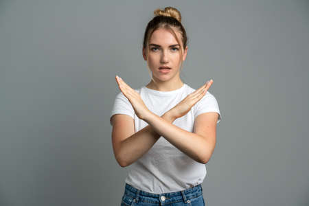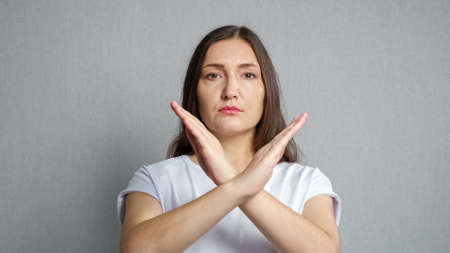 Dark-haired woman in white t-shirt expresses refusal showing cross with arms and performing against grey studio wall closeup