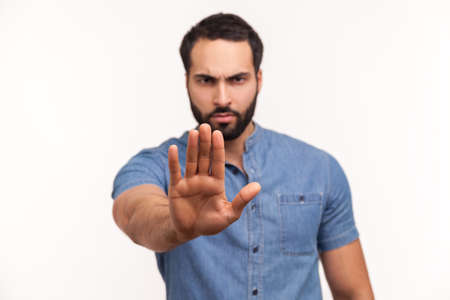 Serious concerned man with beard making stop gesture with palm of his hand, conflict prohibition, warning about danger, stop bullying. Indoor studio shot isolated on white background