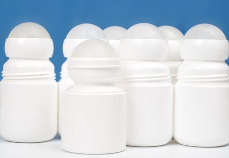 White antiperspirant deodorant on blue background. Skin care concept. copy space. Vertical foto