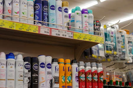 Odessa, Ukraine - April 25, 2020: male and female deodorants inside the supermarket shelf. Sorted by the brand for easy for the customer to choose. Selective focus.