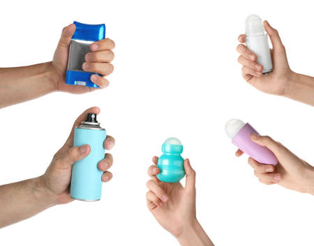 Cartoon deodorant. Antiperspirant cosmetic. Aerosol for sweat odor protection. Roll stick and spray. Personal hygiene and perfume. Isolated cylinder bottles. Vector care products set