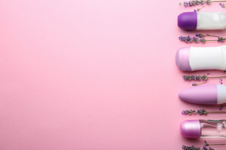 Different female deodorants and lavender flowers on pink background, flat lay. Space for text