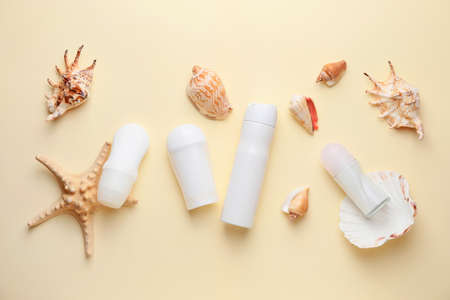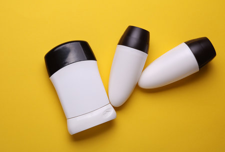 Body antiperspirant deodorants roll-on on yellow background, space for text