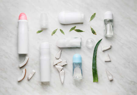 Flat lay composition with deodorant on blue background. Beauty, hygiene, cosmetics concept. Top view, copy space, long format for banner