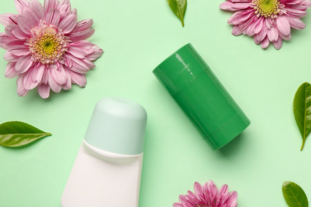 Body antiperspirant deodorants roll-on, leaves and lemon slices on mint background. Blank space