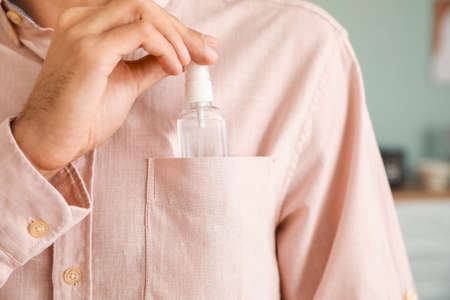 Man with disinfectant at home, closeup