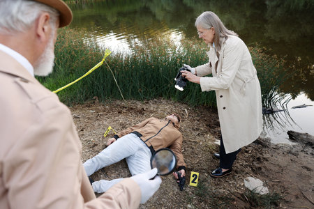 Forensic expertise. Detectives working at crime scene with dead man's body near lake outdoors