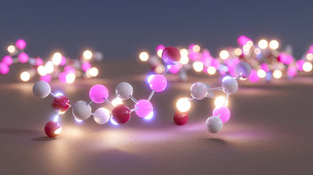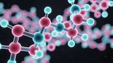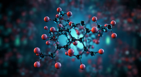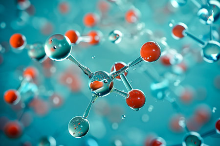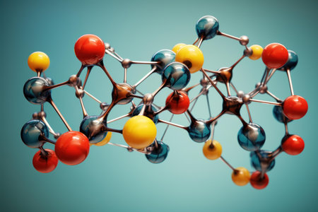 This image features a detailed illustration of a molecular structure, rendered with vibrant colors and interconnected spheres. The background presents a blurred bokeh effect, suggesting depth and adding a dynamic visual appeal. The style leans towards a modern, artistic representation suitable for educational materials or scientific visualizations, offering potential applications in design or editorial projects.