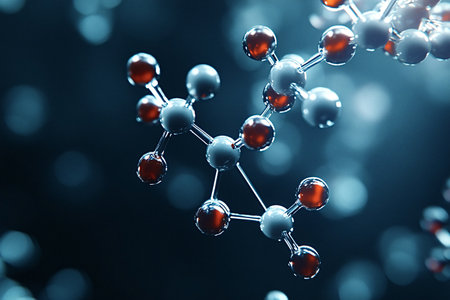 3D rendering of a colorful molecular structure featuring red and black atoms on a blue background, symbolizing chemistry and scientific research innovations.