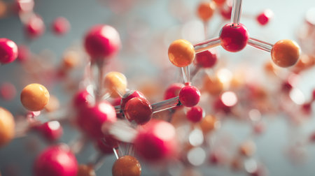 A captivating close-up view of colorful molecules featuring red and orange atoms. The blurred background enhances the vibrant colors, ideal for scientific illustrations and educational materials.