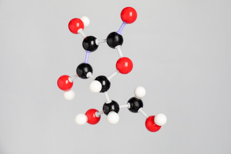 Molecule of vitamin C on light grey background. Chemical model