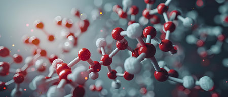 This image showcases a series of abstract molecular structures, rendered in a 3D style. The composition features spheres connected by lines, with a color palette of red, blue, and white against a dark background. This visual could be used in scientific publications, educational materials, or marketing campaigns related to technology.