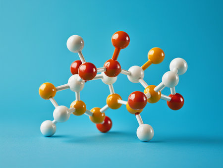 A colorful molecular model, composed of white, red, and orange spheres connected by white rods, sits on a blue surface. The model is angled and appears to be three-dimensional.