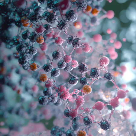 Vivid close-up of abstract molecular structures showing atom connections, scientific beauty, and the complexity of molecular science.