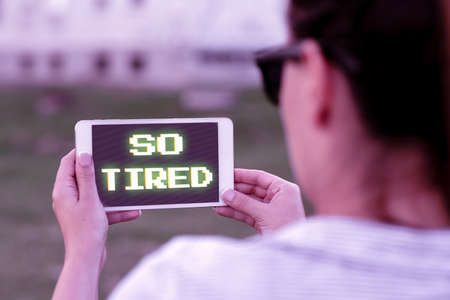 Conceptual caption So Tired. Word for drained of strength and energy Fatigued to the point of exhaustion Voice And Video Calling Capabilities Connecting People Together