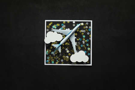 Flight canceled due to coronavirus disease (COVID-19) concept. Face mask, tablet with sign Flight canceled on the screen and plane model on black background. Top view.