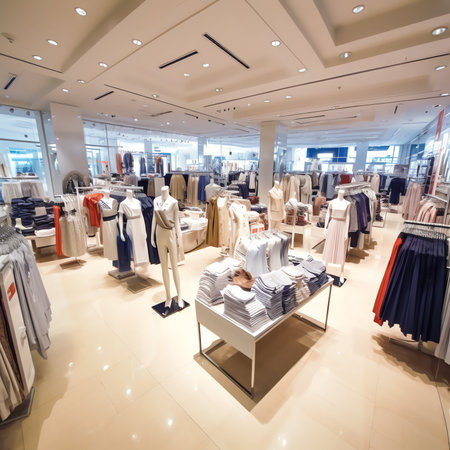 Abstract blurred of fashion clothes shop boutique interior in a shopping mall, with bokeh light background.