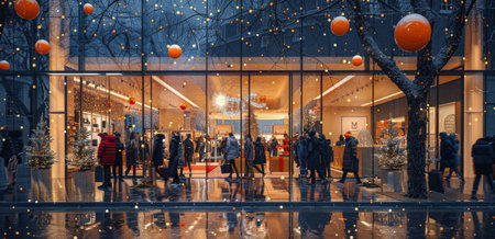 Pedestrians stroll along a wet city street lined with stores lit up by Christmas decor and lights. The warm glow of the storefronts, adorned with trees and wreaths, creates a festive vibe on the rain-soaked sidewalk