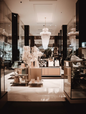 A chandelier hanging from the ceiling in a store. AI generative image.