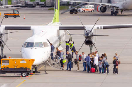 People are boarding in a turboprop aircraft, regional flights from apron, by the stairs. Russia, Moscow, 15 august 2018