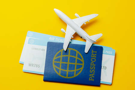Tickets for plane and passport with model of passenger plane on yellow background.