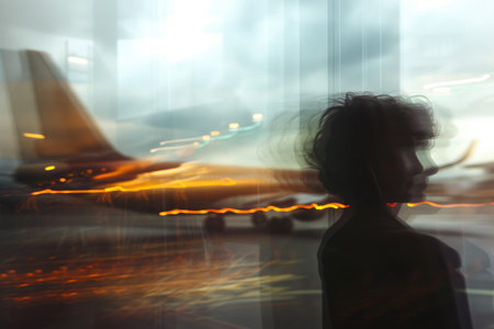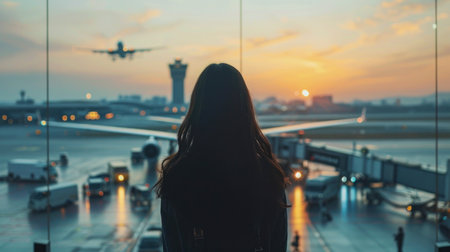 Travel by plane, woman passenger waiting in airport, silhouette of passenger in airport watching aircraft taking off..