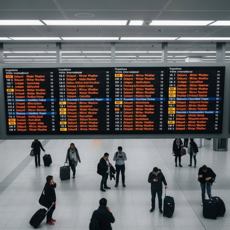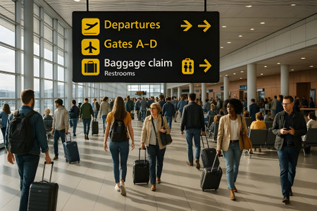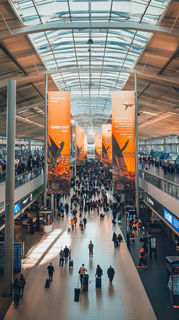 Crowd navigating vibrant airport terminal with high ceilings and flight banners