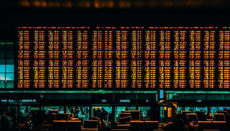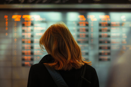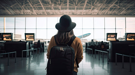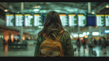 Rear view of a woman looking at arrival departure board. Generative AI illustration