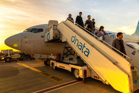 DUBAI, UAE - APRIL 5, 2020: Passengers at the ladder (ramp) at Airplane Flydubai Boeing 737-800 at Dubai International Airport at sunset, Dubai, United Arab Emirates