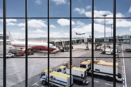 Tourist is looking at the planes taking off from the airport terminal window, ready to board