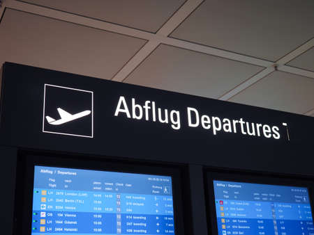KOELN, GERMANY - CIRCA AUGUST 2019: Abflug (Departures) time table screens at Koeln Bonn Airport