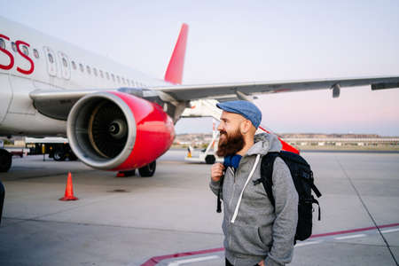 A tourist boy with a beard on the runway of an airport gets on a plane