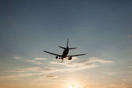 Sunset sky airplane background. Vibrant color sunlight plane flight. Aircraft high in the air. Vacation trip travel texture.