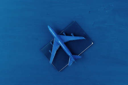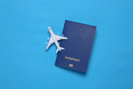 Toy passenger plane and passport on blue background. Voyage, Travel, summer vacation concept. top view