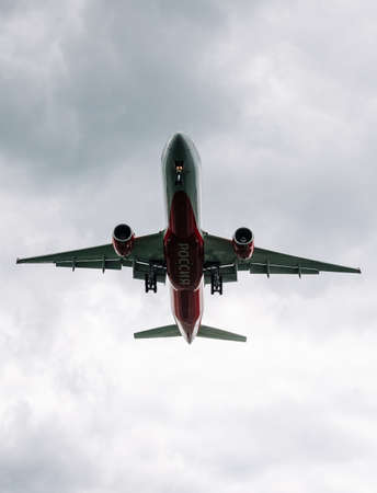 July 13, 2019 Moscow, Russia. Passenger aircraft of Russia Airlines comes in for landing at Sheremetyevo International Airport in cloudy weather.