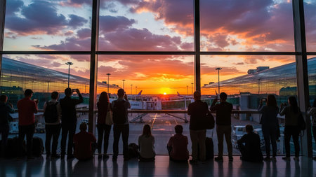 Dramatic sunset view from a terminal window, with an airplane silhouette and rows of empty chairs in the foreground.